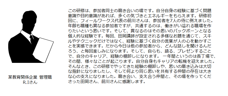 働きがいを育む講師養成講座 10期生募集説明会 1 今、組織に求められる働きがいとは? 働きがいを育む講師・ファシリテーターが、なぜ必要なのか? 2 働きがいマインドをセットする 7つのポイントをアライメント 3 人と組織に働きがいを育む3つの施策 生産性の高い組織を作るために! 4 養成講座の学びについて 一年間の内容と流れについて 5 どのように研修講師になっていくのか? 働きがい創造研究所社長田岡英明のこれまでの軌跡より 6 まとめ・質疑応答 ※プログラム内容は一部変更する場合もございます。 |