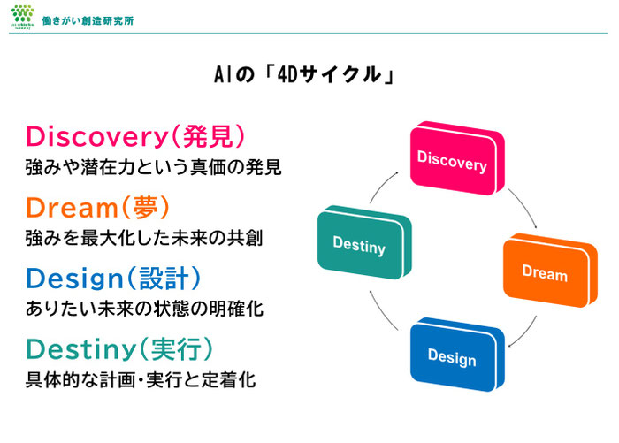 組織開発の手法に決まりがあるわけではないのですが、AIをベースとした働きがい創造研究所で展開している組織開発手法をお伝えしております。
